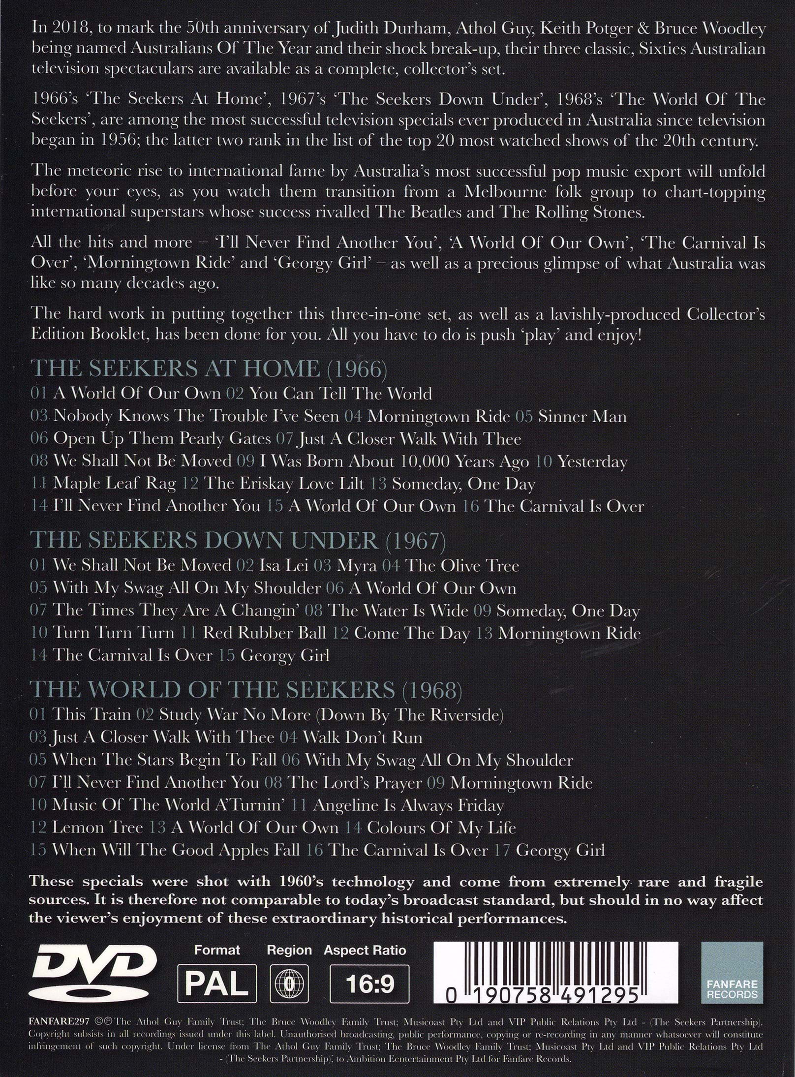 In 2018, to celebrate the 50th anniversary of The Seekers being named Australians of The Year just five months before their surprise break-up, Ambition Music is proud to announce the release of the group’s three classic Australian television spectaculars from the Sixties as a complete DVD set.